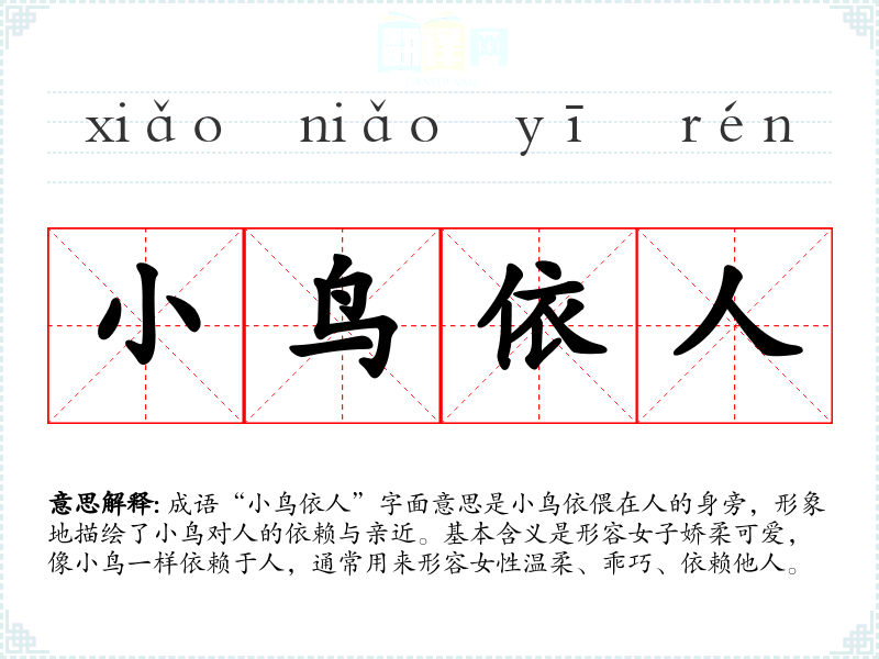 成语“依人”字面意思是依偎在人的身旁,形象地描绘了对人的依赖与亲近。基本含义是形容女子娇柔可爱,像一样依赖于人,通常用来形容女性温柔、乖巧、依赖他人。