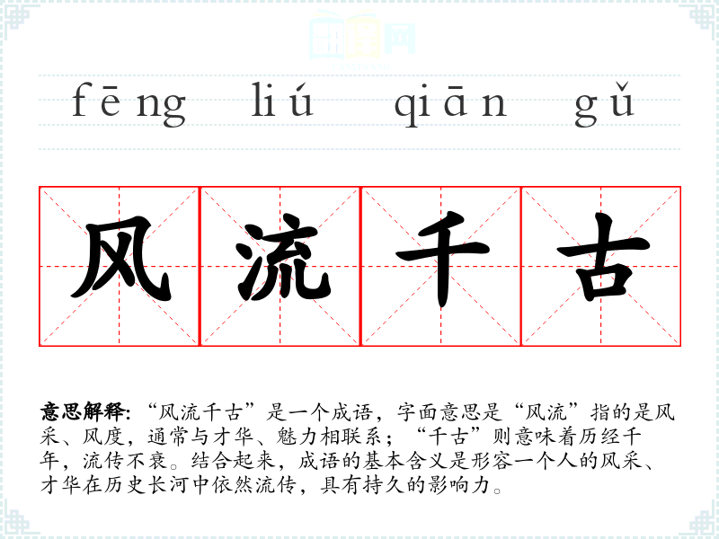 “风流千古”是一个成语,字面意思是“风流”指的是风采、风度,通常与才华、魅力相联系;“千古”则意味着历经千年,流传不衰。结合起来,成语的基本含义是形容一个人的风采、才华在历史长河中依然流传,具有持久的影响力。