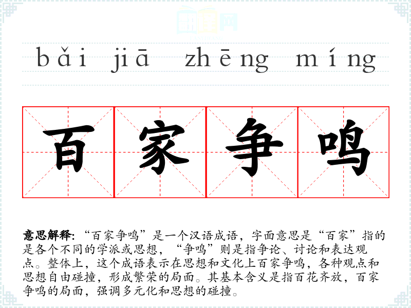 “百家争鸣”是一个汉语成语,字面意思是“百家”指的是各个不同的学派或思想,“争鸣”则是指争论、讨论和表达观点。整体上,这个成语表示在思想和文化上百家争鸣,各种观点和思想自由碰撞,形成繁荣的局面。其基本含义是指百花齐放,百家争鸣的局面,强调多元化和思想的碰撞。