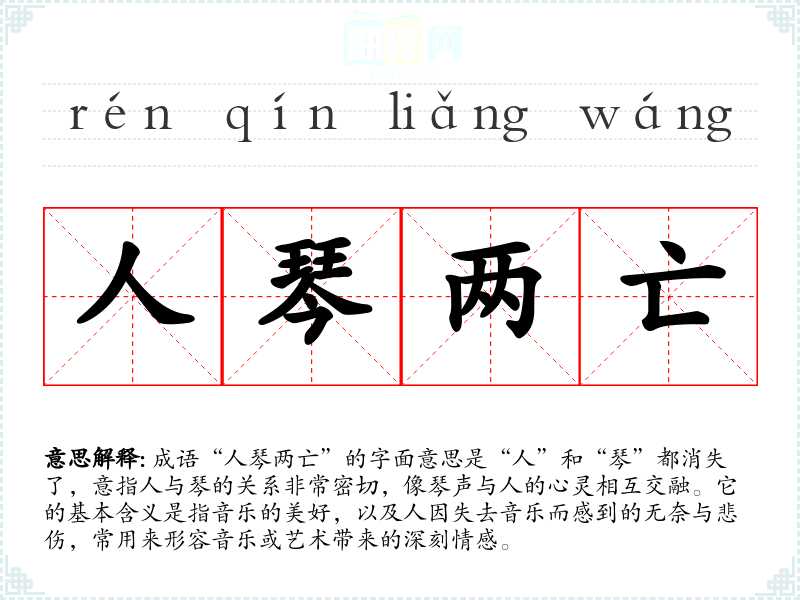 成语“人琴两亡”的字面意思是“人”和“琴”都消失了,意指人与琴的关系非常密切,像琴声与人的心灵相互交融。它的基本含义是指音乐的美好,以及人因失去音乐而感到的无奈与悲伤,常用来形容音乐或艺术带来的深刻情感。