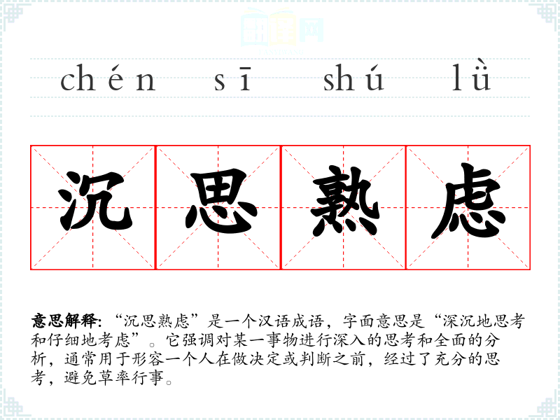“沉思熟虑”是一个汉语成语,字面意思是“深沉地思考和仔细地考虑”。它强调对某一事物进行深入的思考和全面的分析,通常用于形容一个人在做决定或判断之前,经过了充分的思考,避免草率行事。