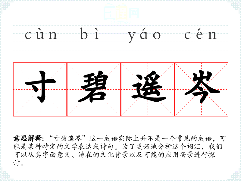 “寸碧遥岑”这一成语实际上并不是一个常见的成语,可能是某种特定的文学表达或诗句。为了更好地分析这个词汇,我们可以从其字面意义、潜在的文化背景以及可能的应用场景进行探讨。