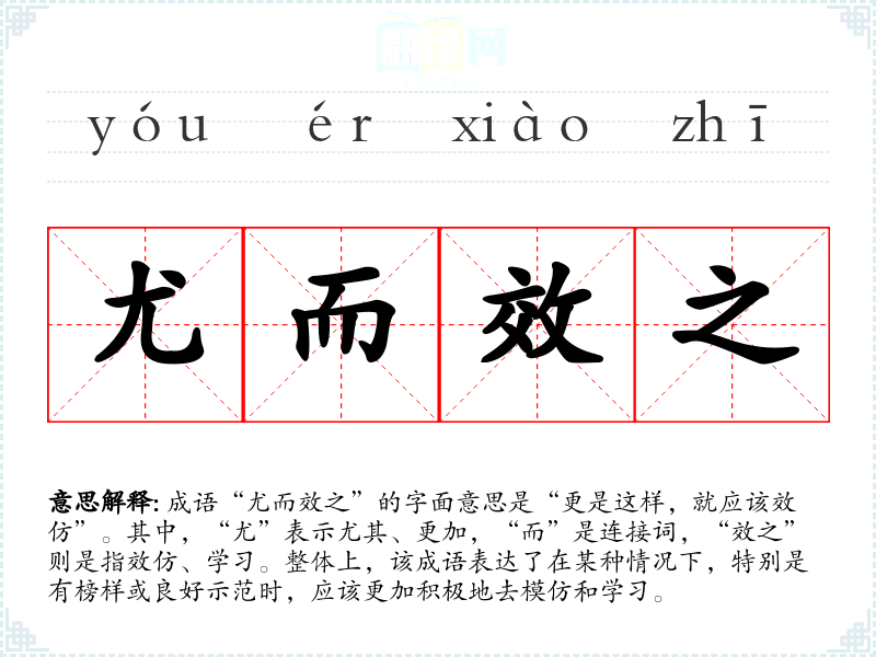 成语“尤而效之”的字面意思是“更是这样,就应该效仿”。其中,“尤”表示尤其、更加,“而”是连接词,“效之”则是指效仿、学。整体上,该成语表达了在某种情况下,特别是有榜样或良好示范时,应该更加积极地去模仿和学。