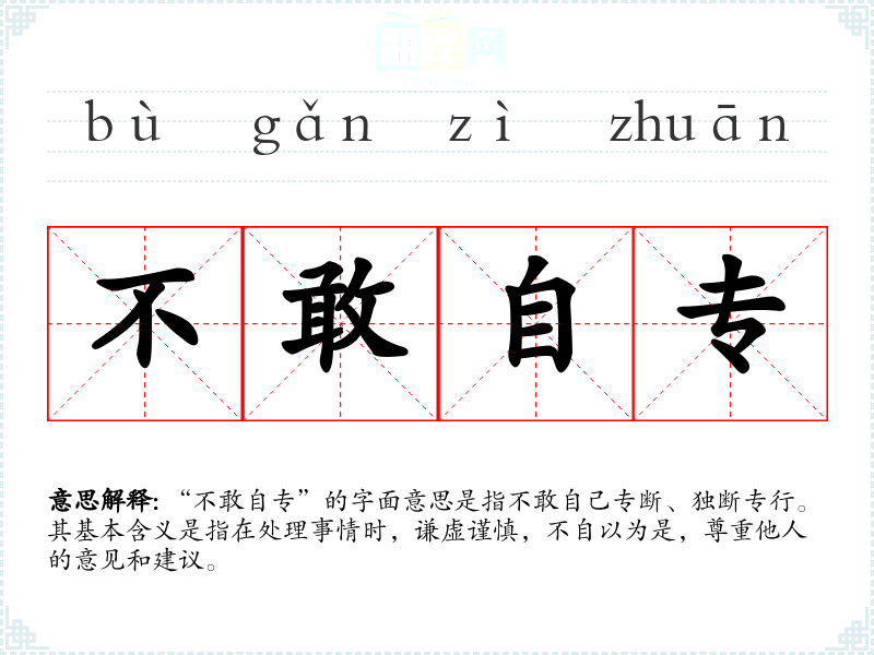 “不敢自专”的字面意思是指不敢自己专断、独断专行。其基本含义是指在处理事情时,谦虚谨慎,不自以为是,尊重他人的意见和建议。