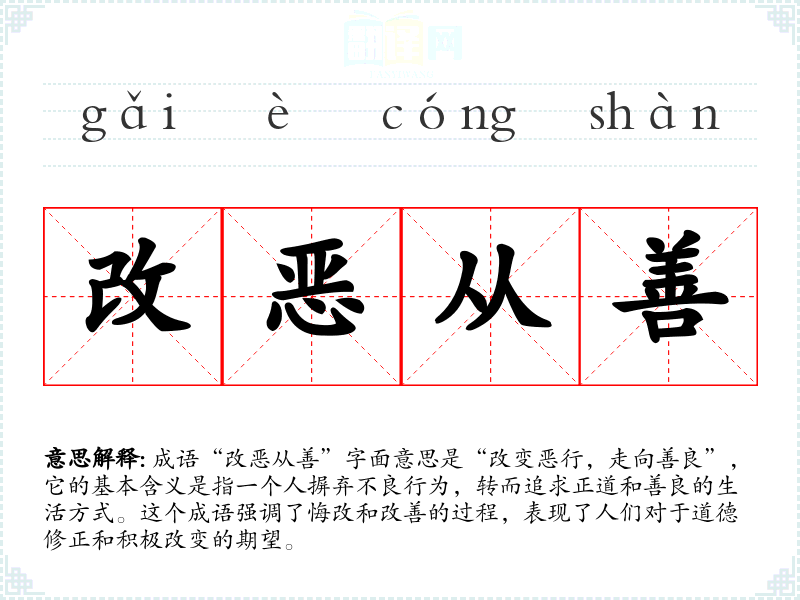 成语“改恶从善”字面意思是“改变恶行,走向善良”,它的基本含义是指一个人摒弃不良行为,转而追求正道和善良的生活方式。这个成语强调了悔改和改善的过程,表现了人们对于道德修正和积极改变的期望。