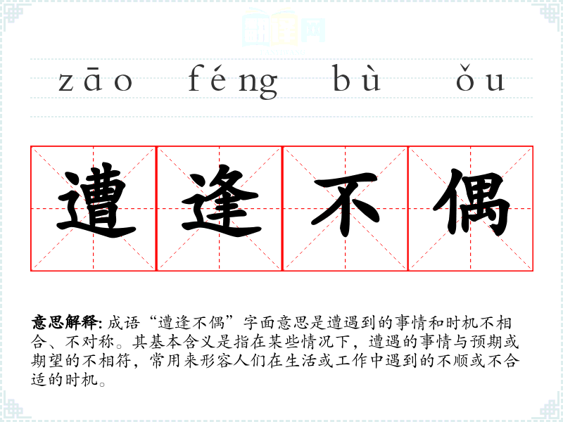 成语“遭逢不偶”字面意思是遭遇到的事情和时机不相合、不对称。其基本含义是指在某些情况下,遭遇的事情与预期或期望的不相符,常用来形容人们在生活或工作中遇到的不顺或不合适的时机。