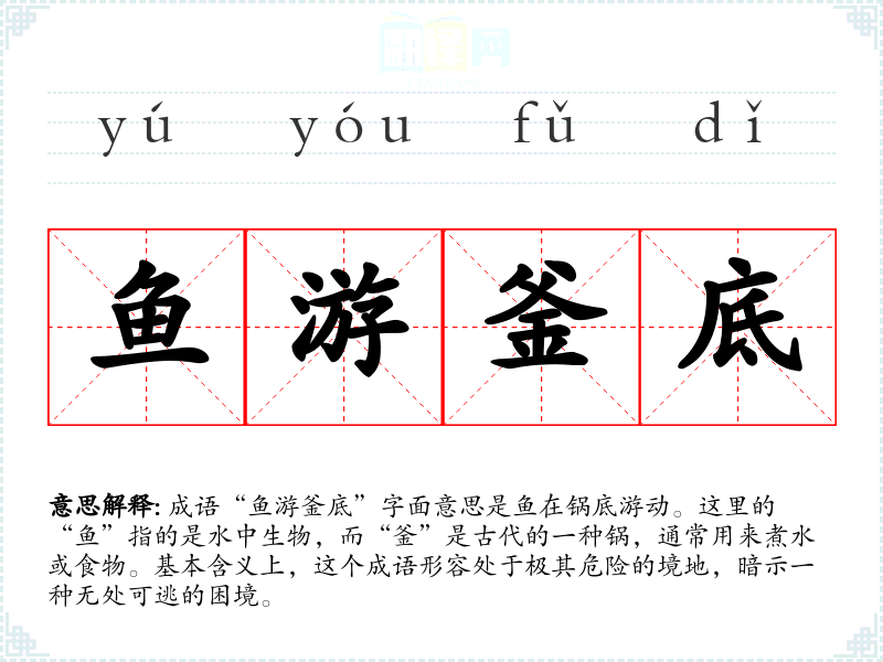 成语“鱼游釜底”字面意思是鱼在锅底游动。这里的“鱼”指的是水中生物,而“釜”是古代的一种锅,通常用来煮水或食物。基本含义上,这个成语形容处于极其危险的境地,暗示一种无处可逃的困境。