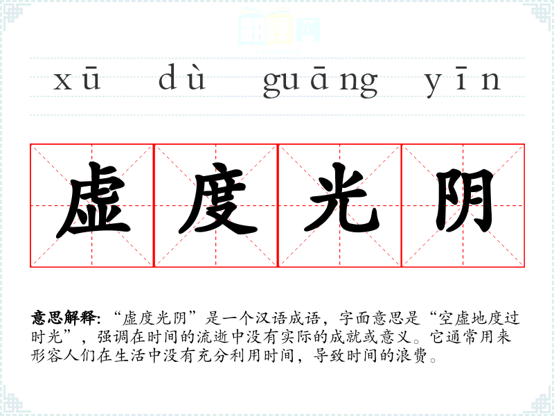 “虚度光阴”是一个汉语成语,字面意思是“空虚地度过时光”,强调在时间的流逝中没有实际的成就或意义。它通常用来形容人们在生活中没有充分利用时间,导致时间的浪费。