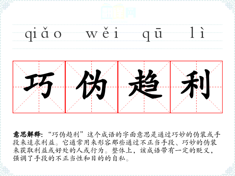 “巧伪趋利”这个成语的字面意思是通过巧妙的伪装或手段来追求利益。它通常用来形容那些通过不正当手段、巧妙的伪装来获取利益或好处的人或行为。整体上,该成语带有一定的贬义,强调了手段的不正当性和目的的自私。