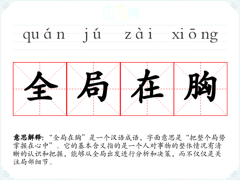 “全局在胸”是一个汉语成语,字面意思是“把整个局势掌握在心中”。它的基本含义指的是一个人对事物的整体情况有清晰的认识和把握,能够从全局出发进行分析和决策,而不仅仅是关注局部细节。