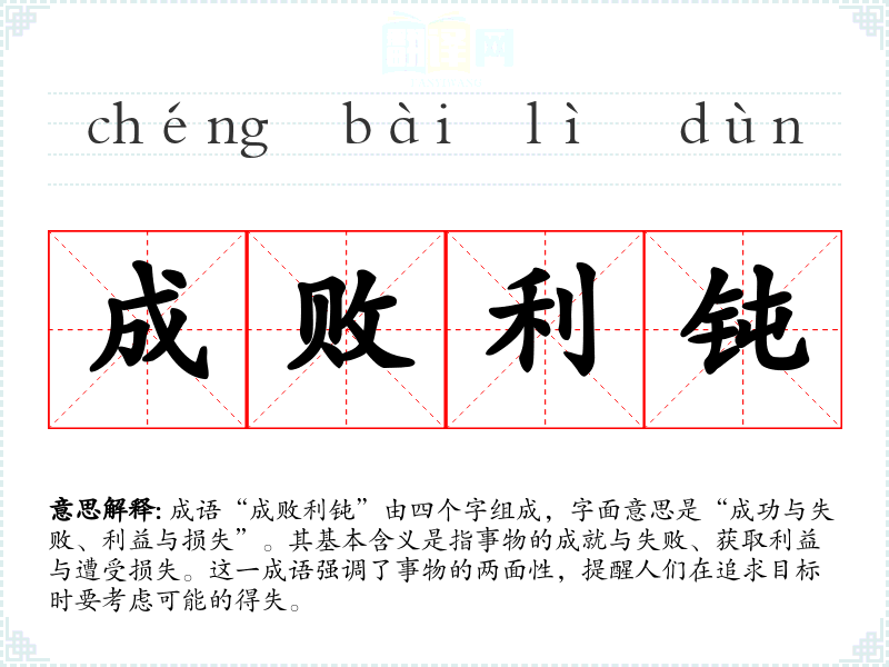 成语“成败利钝”由四个字组成,字面意思是“成功与失败、利益与损失”。其基本含义是指事物的成就与失败、获取利益与遭受损失。这一成语强调了事物的两面性,提醒人们在追求目标时要考虑可能的得失。