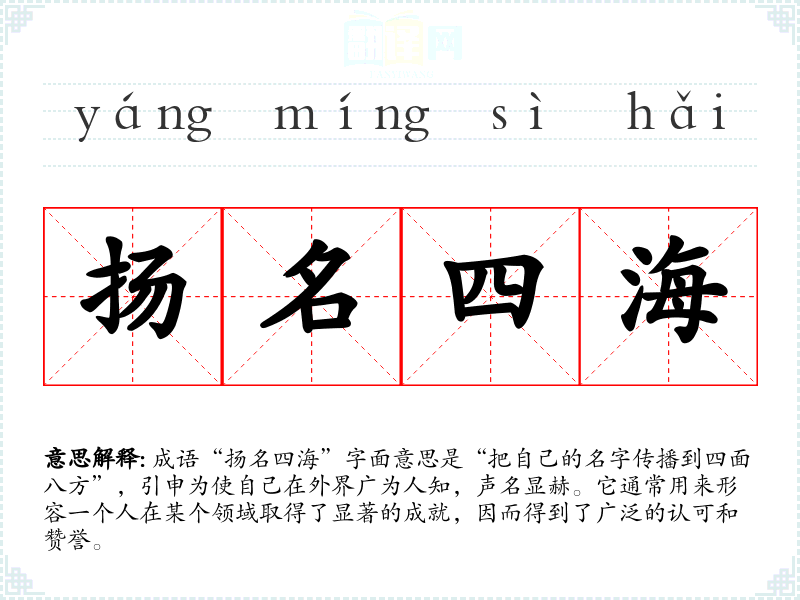 成语“扬名四海”字面意思是“把自己的名字传播到四面八方”,引申为使自己在外界广为人知,声名显赫。它通常用来形容一个人在某个领域取得了显著的成就,因而得到了广泛的认可和赞誉。