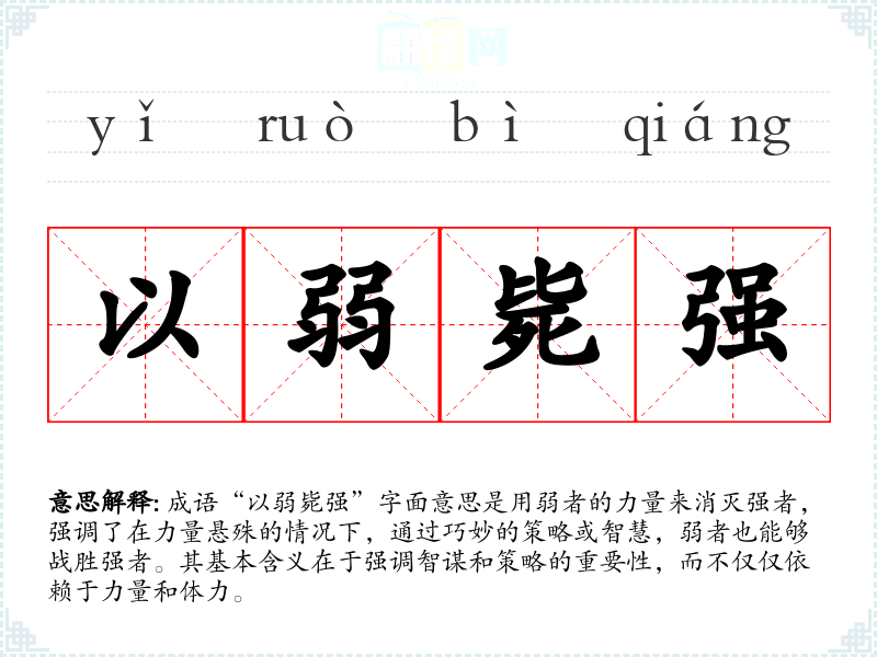 成语“以弱毙强”字面意思是用弱者的力量来消灭强者,强调了在力量悬殊的情况下,通过巧妙的策略或智慧,弱者也能够战胜强者。其基本含义在于强调智谋和策略的重要性,而不仅仅依赖于力量和体力。