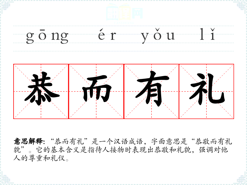 “恭而有礼”是一个汉语成语,字面意思是“恭敬而有礼貌”。它的基本含义是指待人接物时表现出恭敬和礼貌,强调对他人的尊重和礼仪。