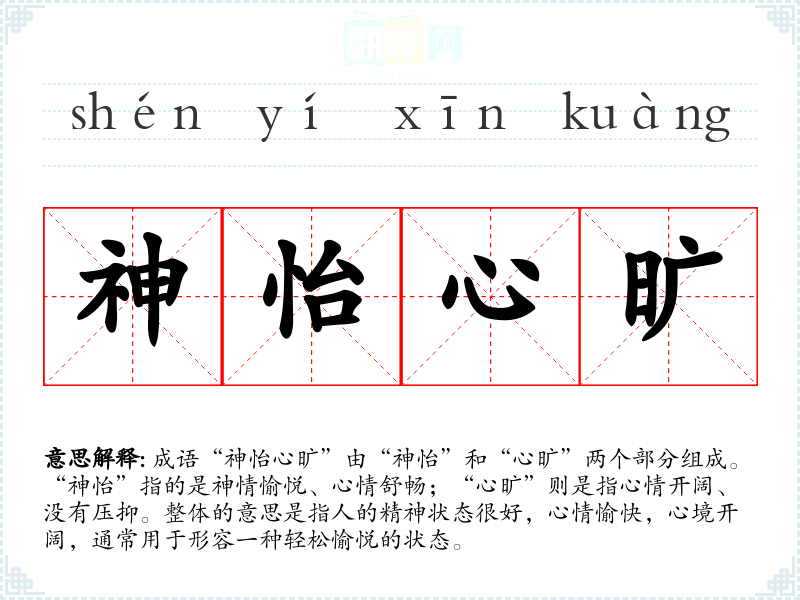 | 神怡心旷 | 精神愉悦,心胸开阔。同“心旷神怡”。 |