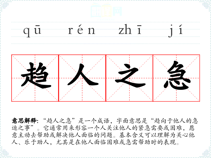 “趋人之急”是一个成语,字面意思是“趋向于他人的急迫之事”。它通常用来形容一个人关注他人的紧急需要或困难,愿意主动去帮助或解决他人面临的问题。基本含义可以理解为关心他人、乐于助人,尤其是在他人面临困难或急需帮助时的表现。