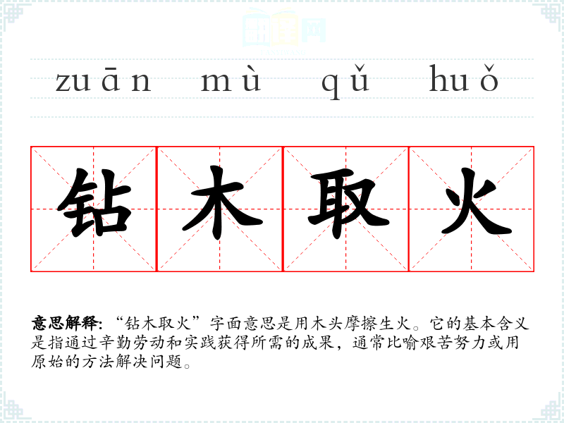 “钻木取火”字面意思是用木头摩擦生火。它的基本含义是指通过辛勤劳动和实践获得所需的成果,通常比喻艰苦努力或用原始的方法解决问题。