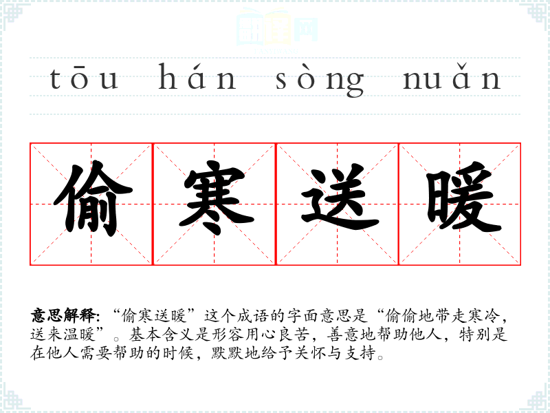 “偷寒送暖”这个成语的字面意思是“偷偷地带走寒冷,送来温暖”。基本含义是形容用心良苦,善意地帮助他人,特别是在他人需要帮助的时候,默默地给予关怀与支持。