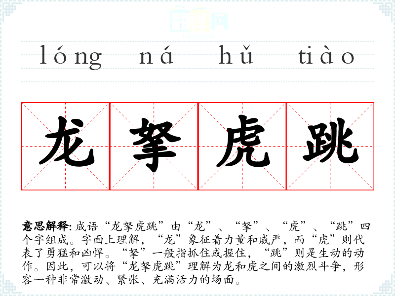 成语“龙拏虎跳”由“龙”、“拏”、“虎”、“跳”四个字组成。字面上理解,“龙”象征着力量和威严,而“虎”则代表了勇猛和凶悍。“拏”一般指抓住或握住,“跳”则是生动的动作。因此,可以将“龙拏虎跳”理解为龙和虎之间的激烈斗争,形容一种非常激动、紧张、充满活力的场面。
