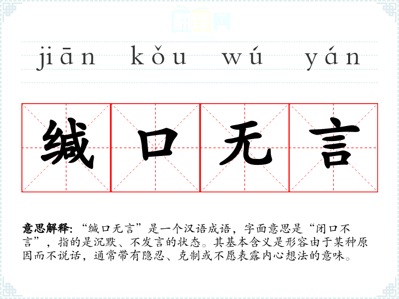 “缄口无言”是一个汉语成语,字面意思是“闭口不言”,指的是沉默、不发言的状态。其基本含义是形容由于某种原因而不说话,通常带有隐忍、克制或不愿表露内心想法的意味。