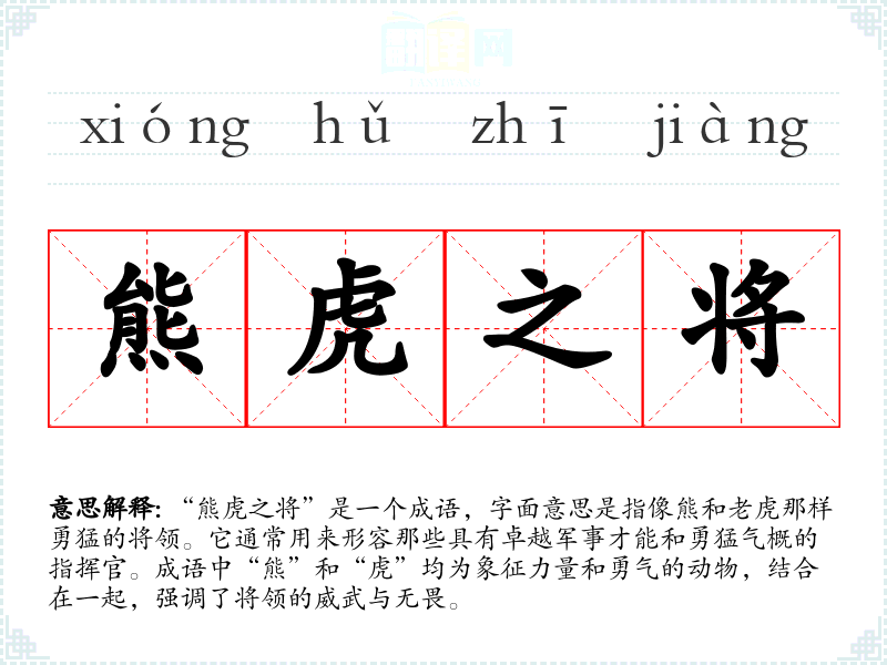 在英语中,“熊虎之将”可以与“a lion-hearted leader”对应,意指勇敢的领导者。虽然两者在文化背景和动物象征上有所不同,但都表达了对勇气和领导力的赞美。