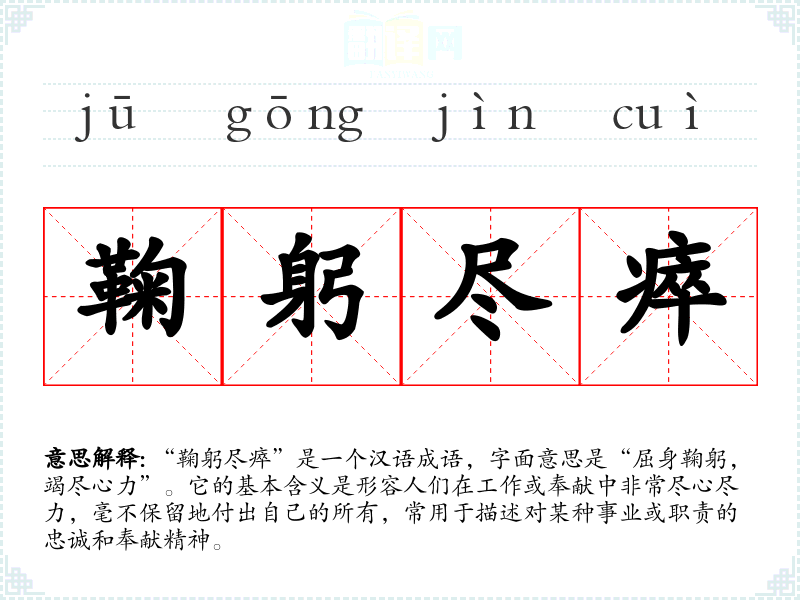 “鞠躬尽瘁”是一个汉语成语,字面意思是“屈身鞠躬,竭尽心力”。它的基本含义是形容人们在工作或奉献中非常尽心尽力,毫不保留地付出自己的所有,常用于描述对某种事业或职责的忠诚和奉献精神。
