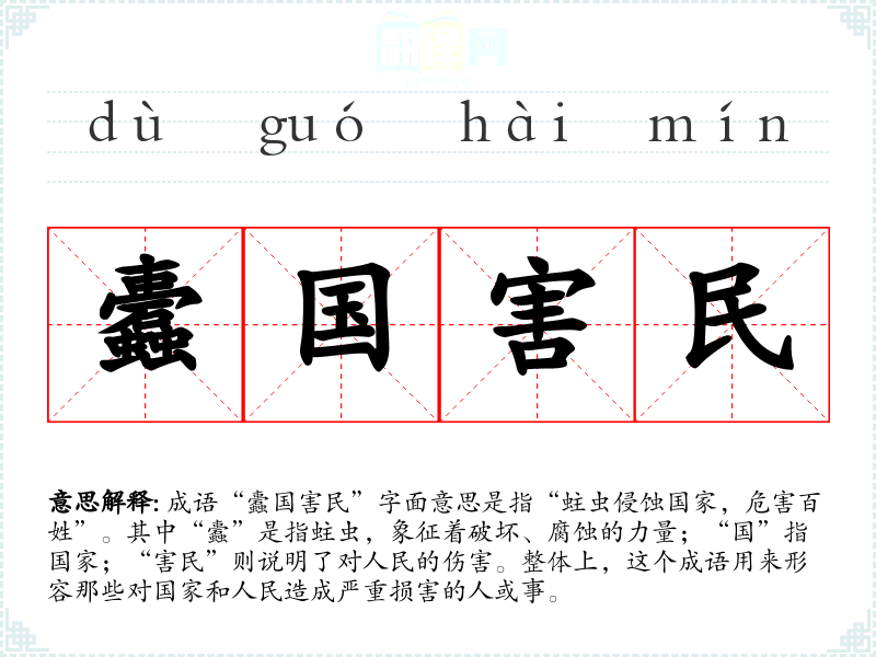 成语“蠹国害民”字面意思是指“蛀虫侵蚀国家,危害百姓”。其中“蠹”是指蛀虫,象征着破坏、腐蚀的力量;“国”指国家;“害民”则说明了对人民的伤害。整体上,这个成语用来形容那些对国家和人民造成严重损害的人或事。