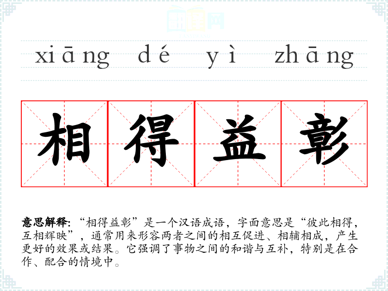 “相得益彰”是一个汉语成语,字面意思是“彼此相得,互相辉映”,通常用来形容两者之间的相互促进、相辅相成,产生更好的效果或结果。它强调了事物之间的和谐与互补,特别是在合作、配合的情境中。