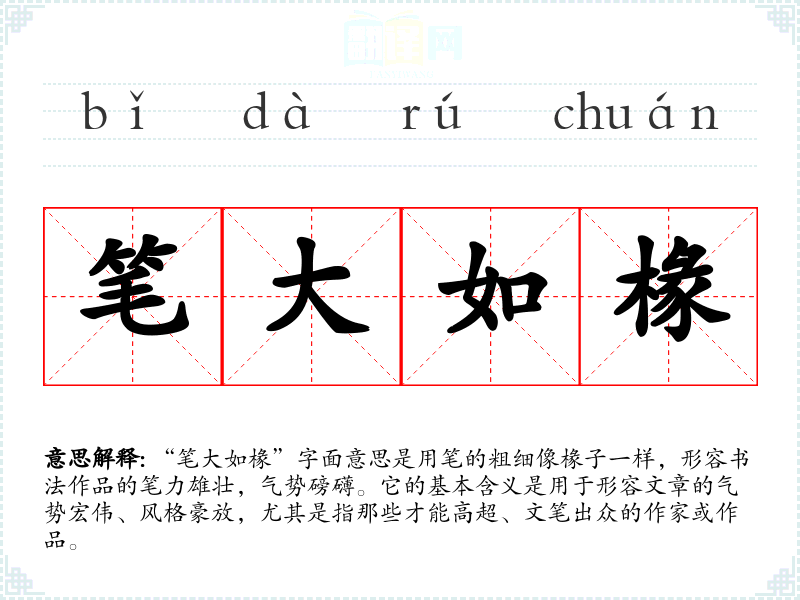 “笔大如椽”字面意思是用笔的粗细像椽子一样,形容书法作品的笔力雄壮,气势磅礴。它的基本含义是用于形容文章的气势宏伟、风格豪放,尤其是指那些才能高超、文笔出众的作家或作品。