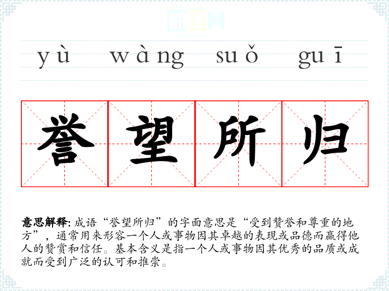 成语“誉望所归”的字面意思是“受到赞誉和尊重的地方”,通常用来形容一个人或事物因其卓越的表现或品德而赢得他人的赞赏和信任。基本含义是指一个人或事物因其优秀的品质或成就而受到广泛的认可和推崇。