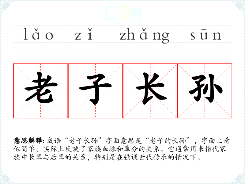 “老子长孙”并不是一个传统的成语,而是一个较为口语化的表达。其背景可能与传统文化中的家族观念有关,强调家族的延续与尊重长辈。古代社会重视血缘关系,长孙作为家族中的重要一员,承载着家族的期望和传统。