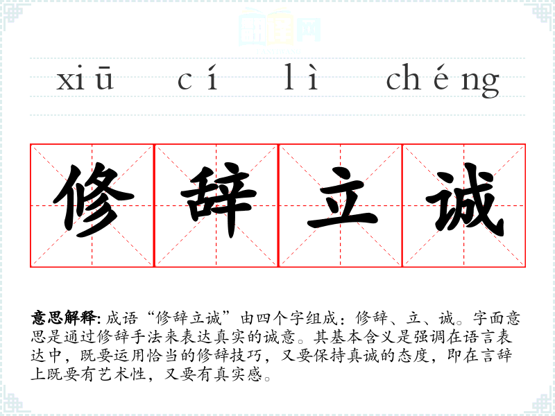 成语“修辞立诚”由四个字组成:修辞、立、诚。字面意思是通过修辞手法来表达真实的诚意。其基本含义是强调在语言表达中,既要运用恰当的修辞技巧,又要保持真诚的态度,即在言辞上既要有艺术性,又要有真实感。