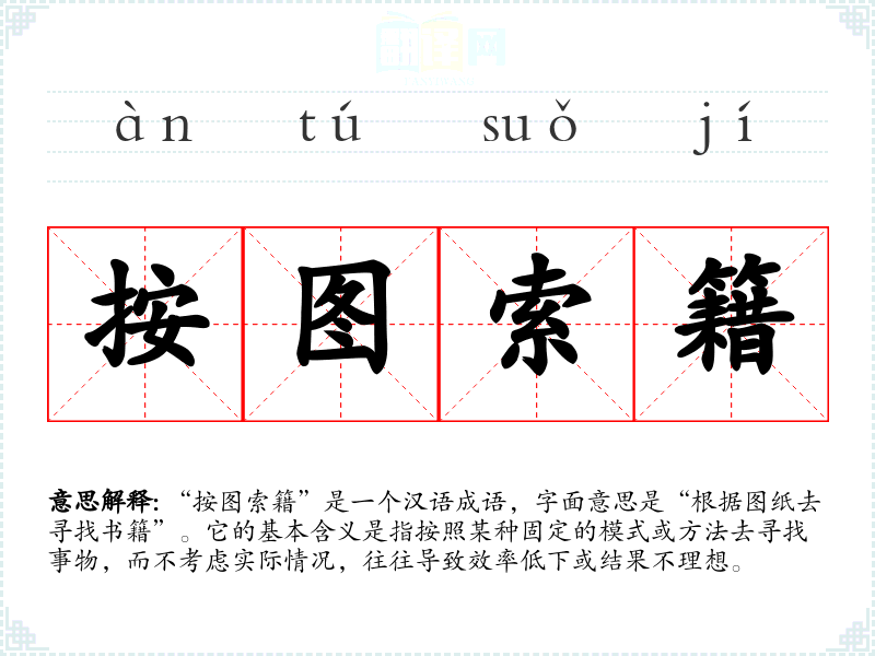 “按图索籍”是一个汉语成语,字面意思是“根据图纸去寻找书籍”。它的基本含义是指按照某种固定的模式或方法去寻找事物,而不考虑实际情况,往往导致效率低下或结果不理想。