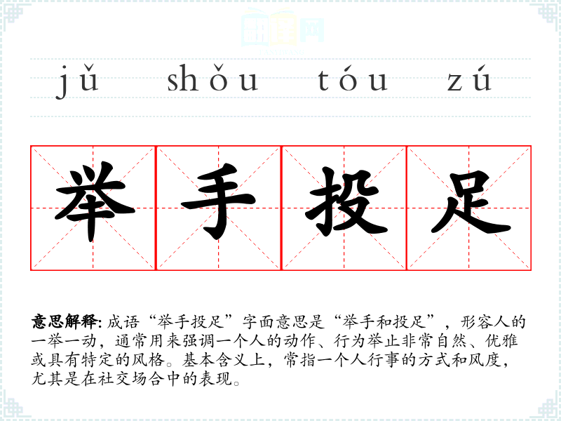 成语“举手投足”字面意思是“举手和投足”,形容人的一举一动,通常用来强调一个人的动作、行为举止非常自然、优雅或具有特定的风格。基本含义上,常指一个人行事的方式和风度,尤其是在社交场合中的表现。