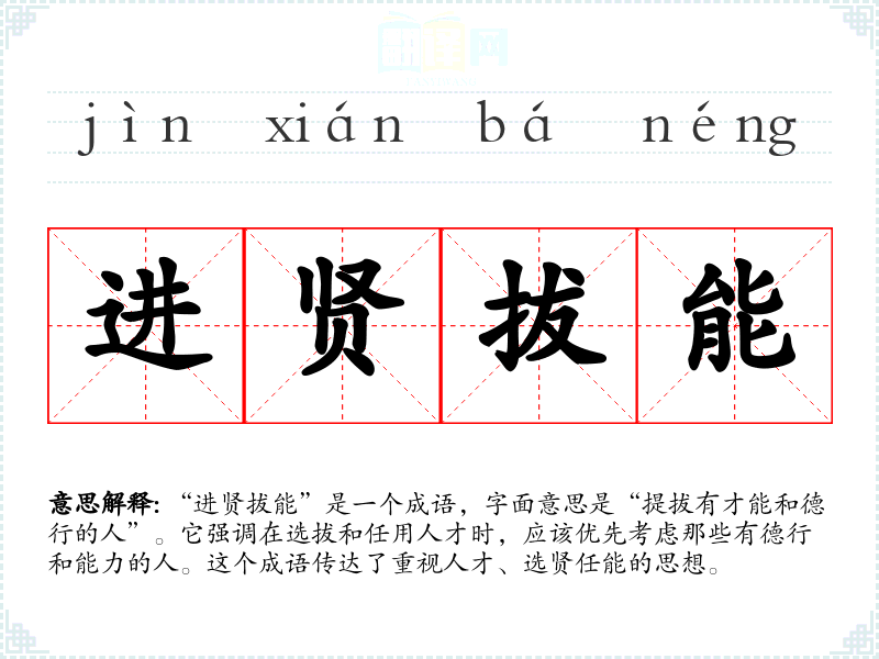 “进贤拔能”是一个成语,字面意思是“提拔有才能和德行的人”。它强调在选拔和任用人才时,应该优先考虑那些有德行和能力的人。这个成语传达了重视人才、选贤任能的思想。