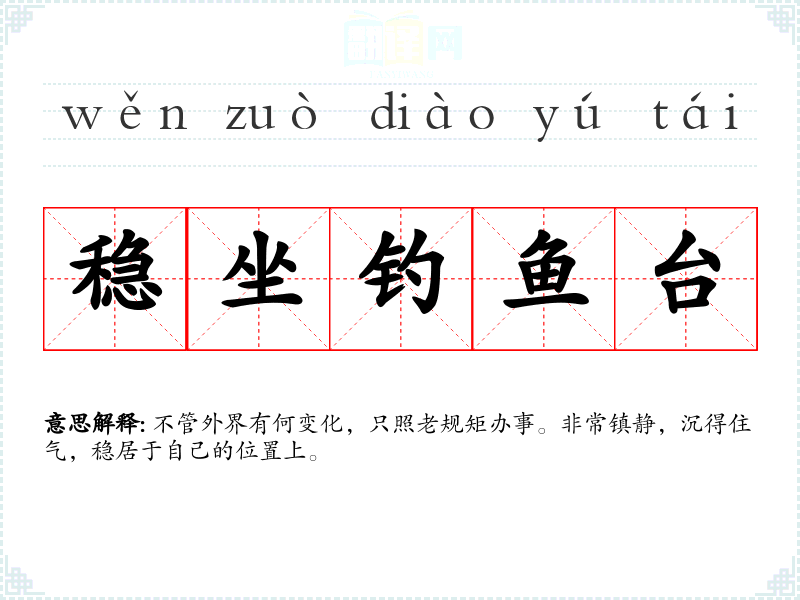 | 稳坐钓鱼台 | 不管外界有何变化,只照老规矩办事。非常镇静,沉得住气,稳居于自己的位置上。 |