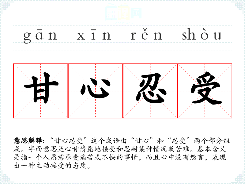 在我自己的生活中,我曾经历过一段困难时期,工作压力巨大,但我选择了“甘心忍受”,努力调整自己的心态,最终克服了那些挑战。这种经历让我更加理解了这个成语的含义,也使我在面对未来的困难时更加从容。
