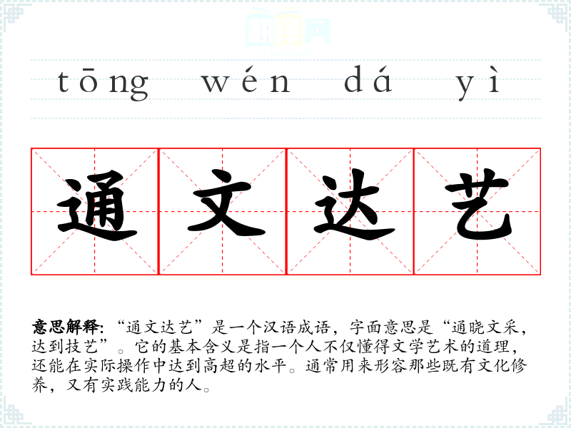 “通文达艺”是一个汉语成语,字面意思是“通晓文采,达到技艺”。它的基本含义是指一个人不仅懂得文学艺术的道理,还能在实际操作中达到高超的水平。通常用来形容那些既有文化修养,又有实践能力的人。