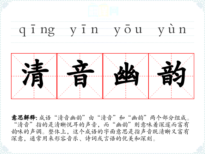 成语“清音幽韵”由“清音”和“幽韵”两个部分组成。“清音”指的是清晰悦耳的声音,而“幽韵”则意味着深邃而富有韵味的声调。整体上,这个成语的字面意思是指声音既清晰又富有深意,通常用来形容音乐、诗词或言语的优美和深刻。