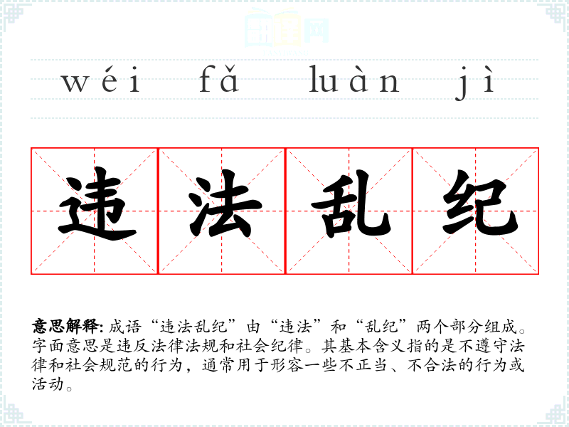 成语“违法乱纪”由“违法”和“乱纪”两个部分组成。字面意思是违反法律法规和社会纪律。其基本含义指的是不遵守法律和社会规范的行为,通常用于形容一些不正当、不合法的行为或活动。
