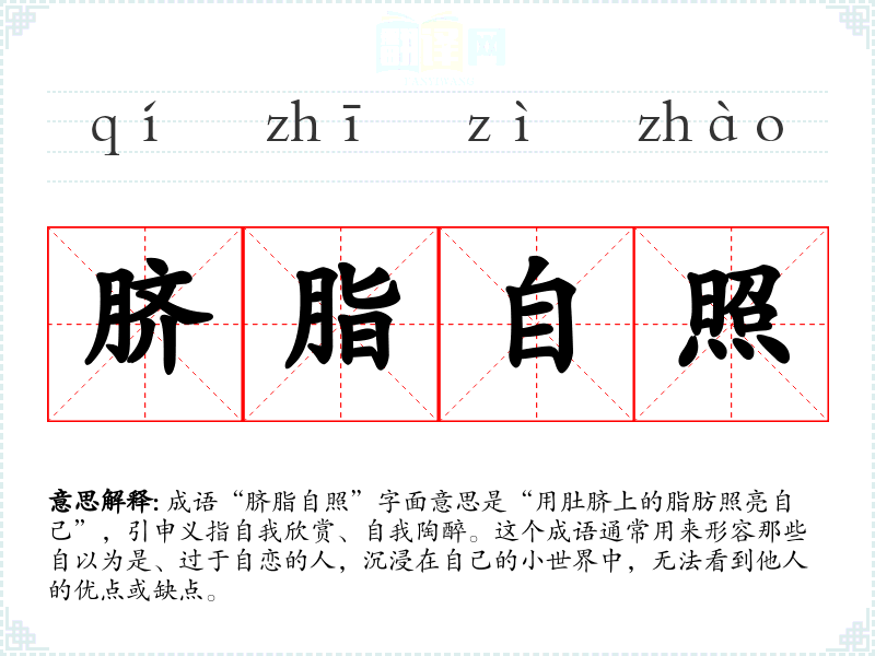 成语“脐脂自照”字面意思是“用肚脐上的脂肪照亮自己”,引申义指自我欣赏、自我陶醉。这个成语通常用来形容那些自以为是、过于自恋的人,沉浸在自己的小世界中,无法看到他人的优点或缺点。