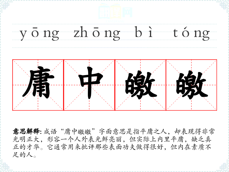 成语“庸中皦皦”字面意思是指平庸之人,却表现得非常光明正大,形容一个人外表光鲜亮丽,但实际上内里平庸,缺乏真正的才华。它通常用来批评那些表面功夫做得很好,但内在素质不足的人。