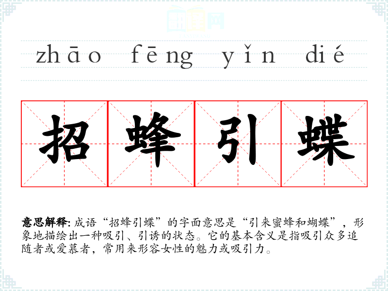 成语“招蜂引蝶”的字面意思是“引来蜜蜂和蝴蝶”,形象地描绘出一种吸引、引诱的状态。它的基本含义是指吸引众多追随者或爱慕者,常用来形容女性的魅力或吸引力。