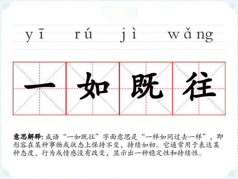 成语“一如既往”字面意思是“一样如同过去一样”,即形容在某种事物或状态上保持不变,持续如初。它通常用于表达某种态度、行为或情感没有改变,显示出一种稳定性和持续性。