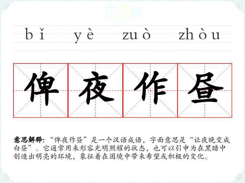 “俾夜作昼”是一个汉语成语,字面意思是“让夜晚变成白昼”。它通常用来形容光明照耀的状态,也可以引申为在黑暗中创造出明亮的环境,象征着在困境中带来希望或积极的变化。