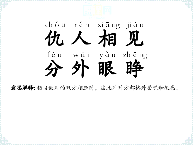 指当敌对的双方相逢时,彼此对对方都格外警觉和敏感。 |