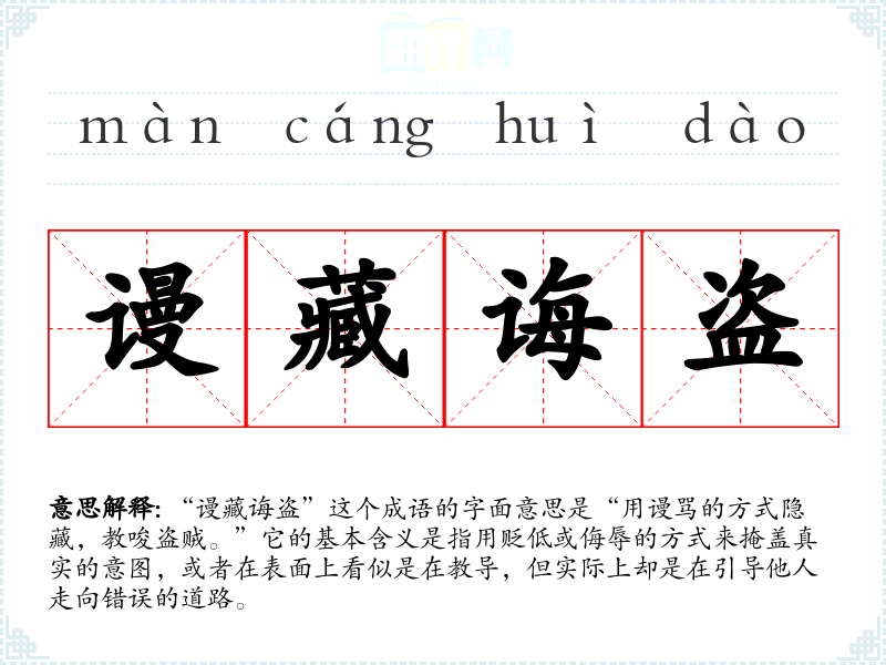 “谩藏诲盗”这个成语的字面意思是“用谩骂的方式隐藏,教唆盗贼。”它的基本含义是指用贬低或侮辱的方式来掩盖真实的意图,或者在表面上看似是在教导,但实际上却是在引导他人走向错误的道路。