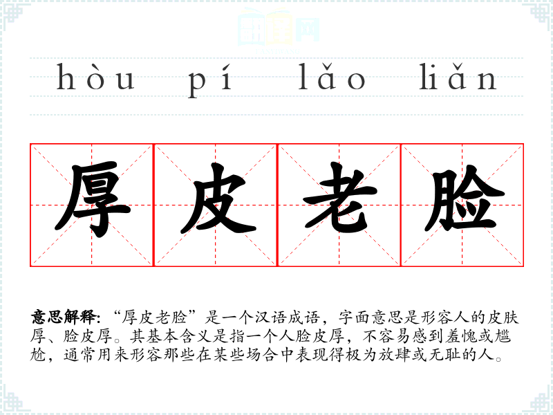 “厚皮老脸”是一个汉语成语,字面意思是形容人的皮肤厚、脸皮厚。其基本含义是指一个人脸皮厚,不容易感到羞愧或尴尬,通常用来形容那些在某些场合中表现得极为放肆或无耻的人。