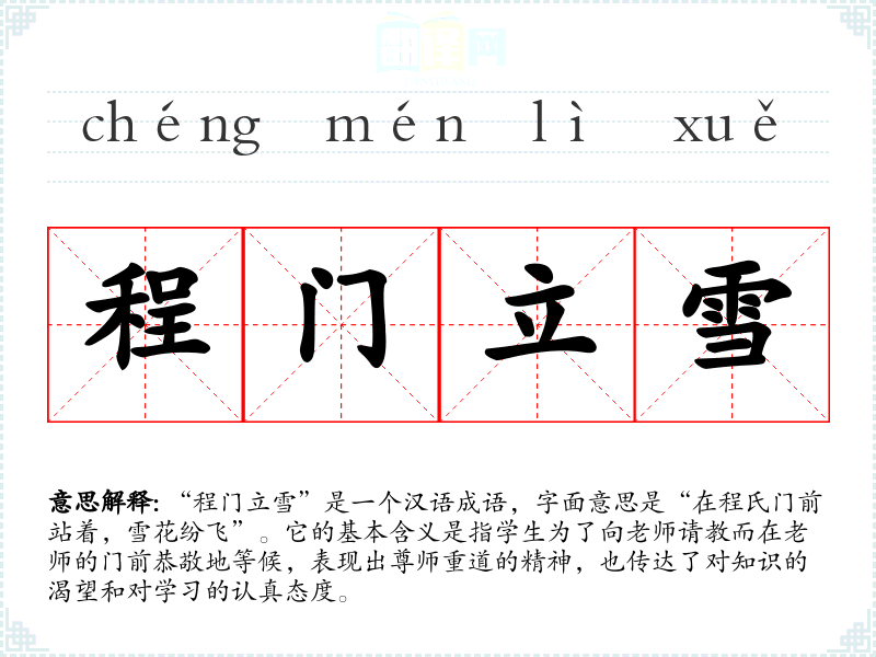 “程门立雪”是一个汉语成语,字面意思是“在程氏门前站着,雪花纷飞”。它的基本含义是指学生为了向老师请教而在老师的门前恭敬地等候,表现出尊师重道的精神,也传达了对知识的渴望和对学*的认真态度。