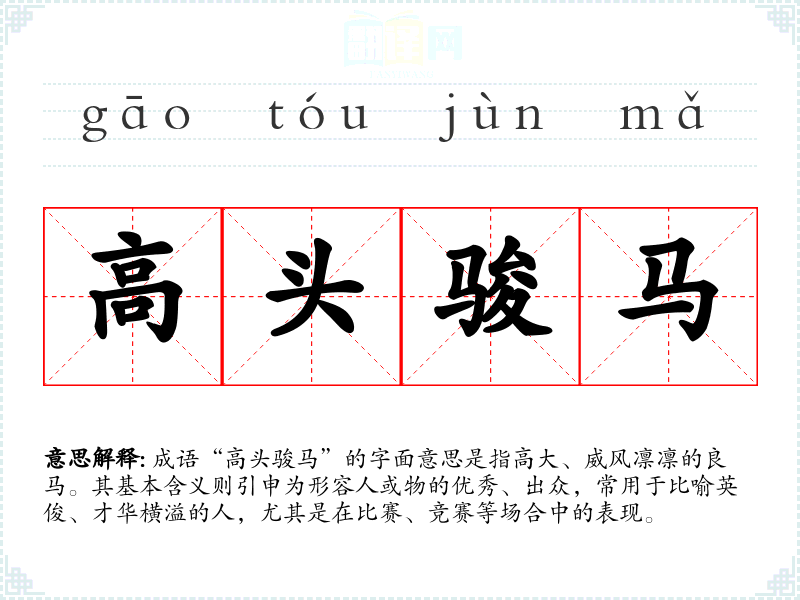 成语“高头骏马”的字面意思是指高大、威风凛凛的良马。其基本含义则引申为形容人或物的优秀、出众,常用于比喻英俊、才华横溢的人,尤其是在比赛、竞赛等场合中的表现。
